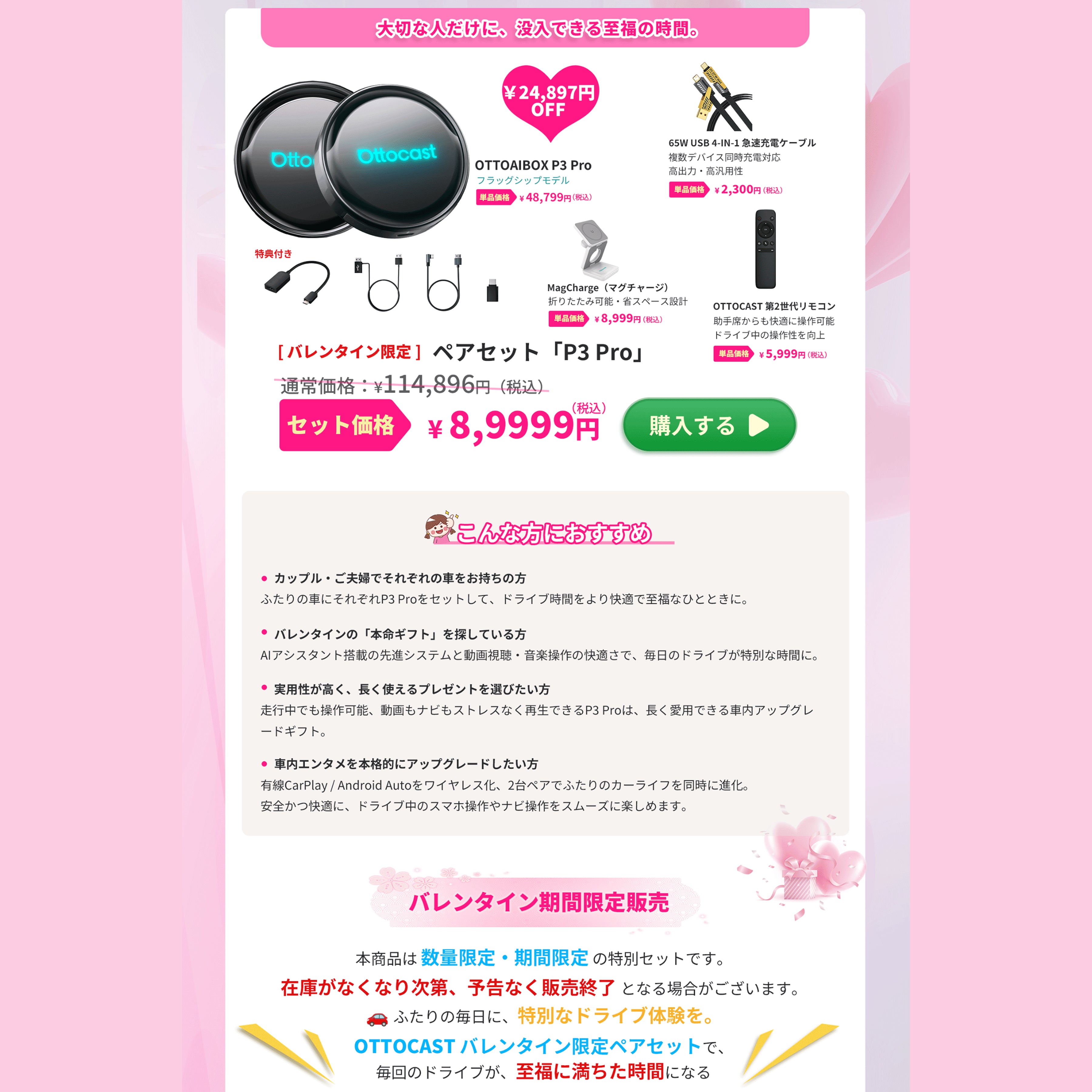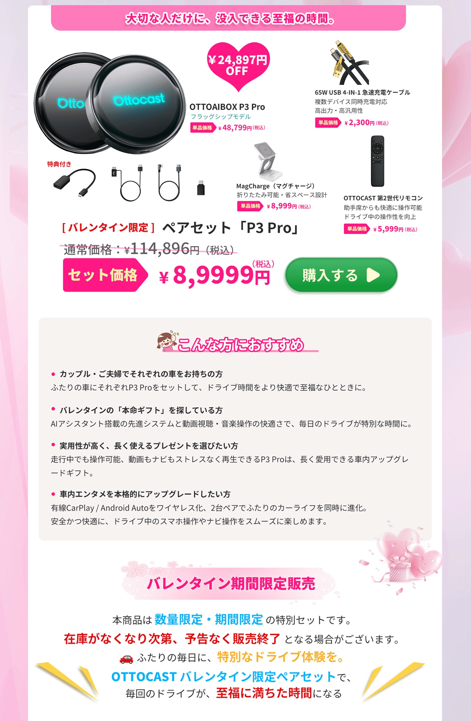 瞬時に有線接続をワイヤレス化し、人気アプリも自由に楽しめるスマートカーアダプター。 4GB RAM+64GBストレージ搭載で、アプリ起動もスムーズに。 安定性に優れたクローズドシステムにより、エンジン始動と同時に自動接続。アップデートもすべて自動で管理されるため、面倒な設定は不要です。 つなぐ一瞬、変わる体験。 あなたの車内エンタメを、もっと自由に、もっと快適に。