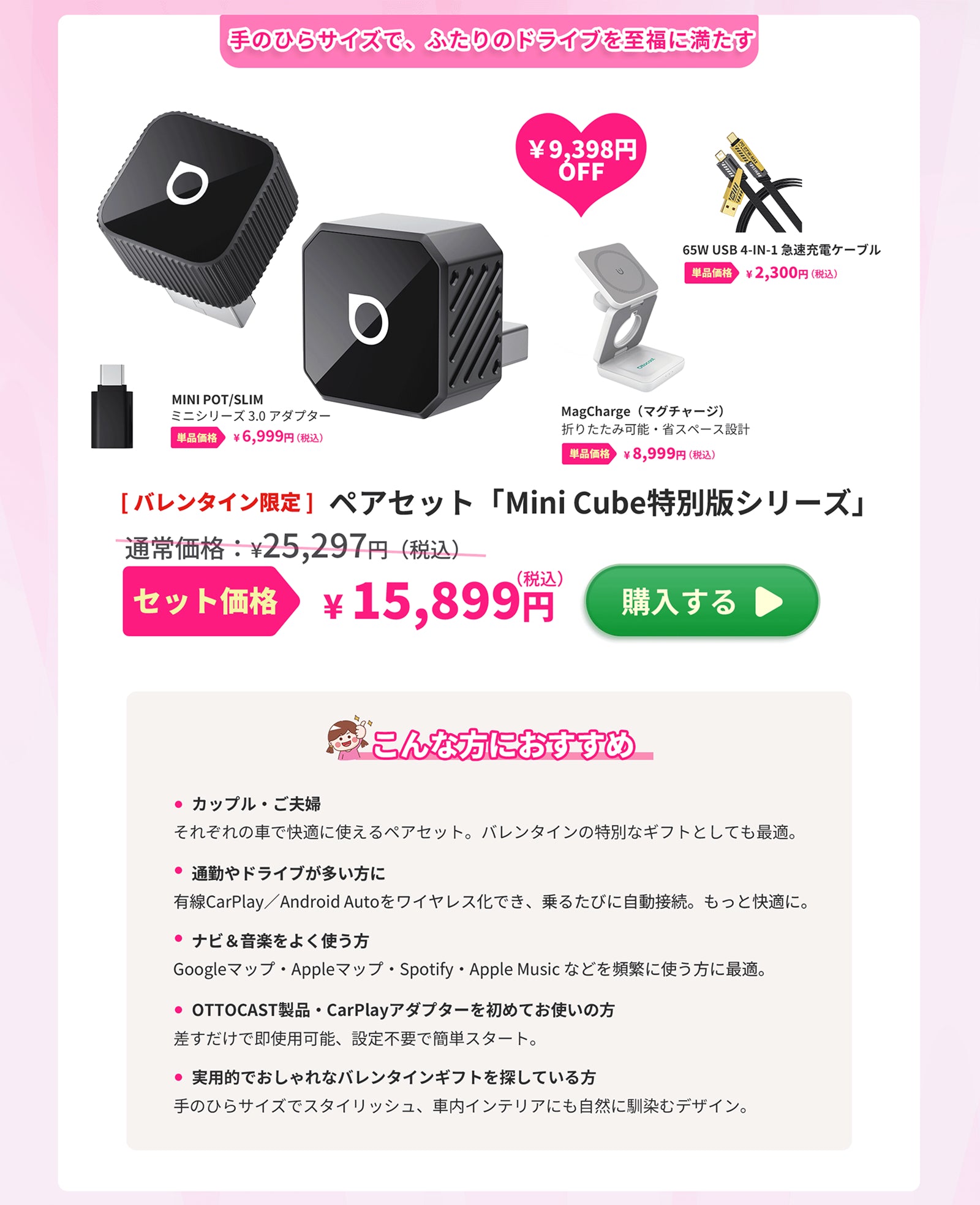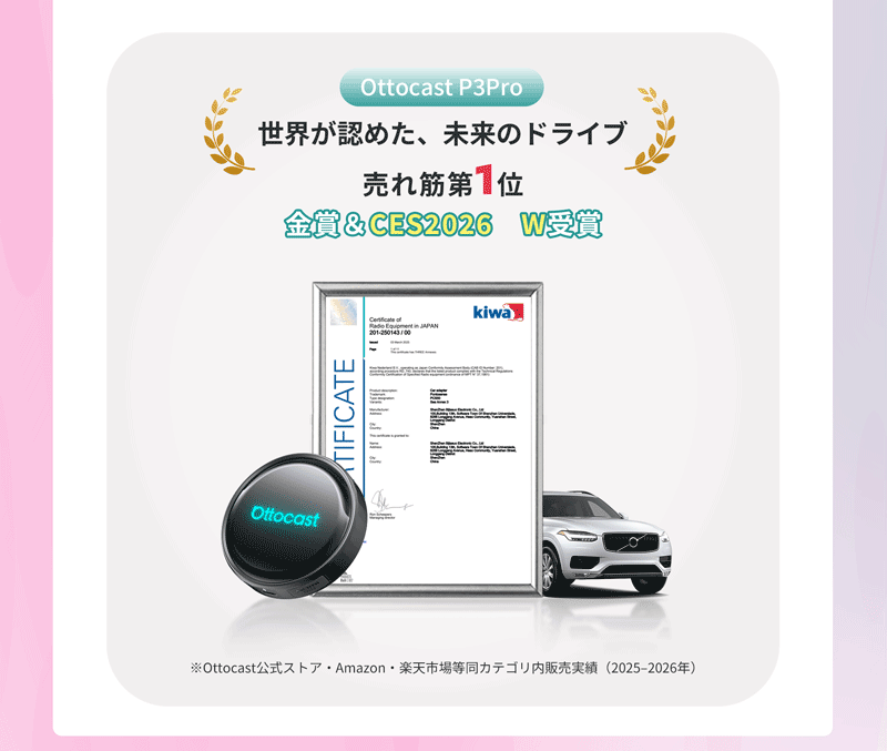 有線CarPlay/Android Autoをわずか数秒でワイヤレス化できる超ミニサイズのデザインで、マップ操作や通話、音楽ストリーミング、ナビ操作まで快適に拡張。アプリや面倒な設定は一切不要、差し込むだけのプラグ&プレイで即使用可能。デバイスを記憶してエンジン始動時に高速自動再接続し、さらにOttoPilotアプリによる自動アップデートで、いつでも最新の互換性。