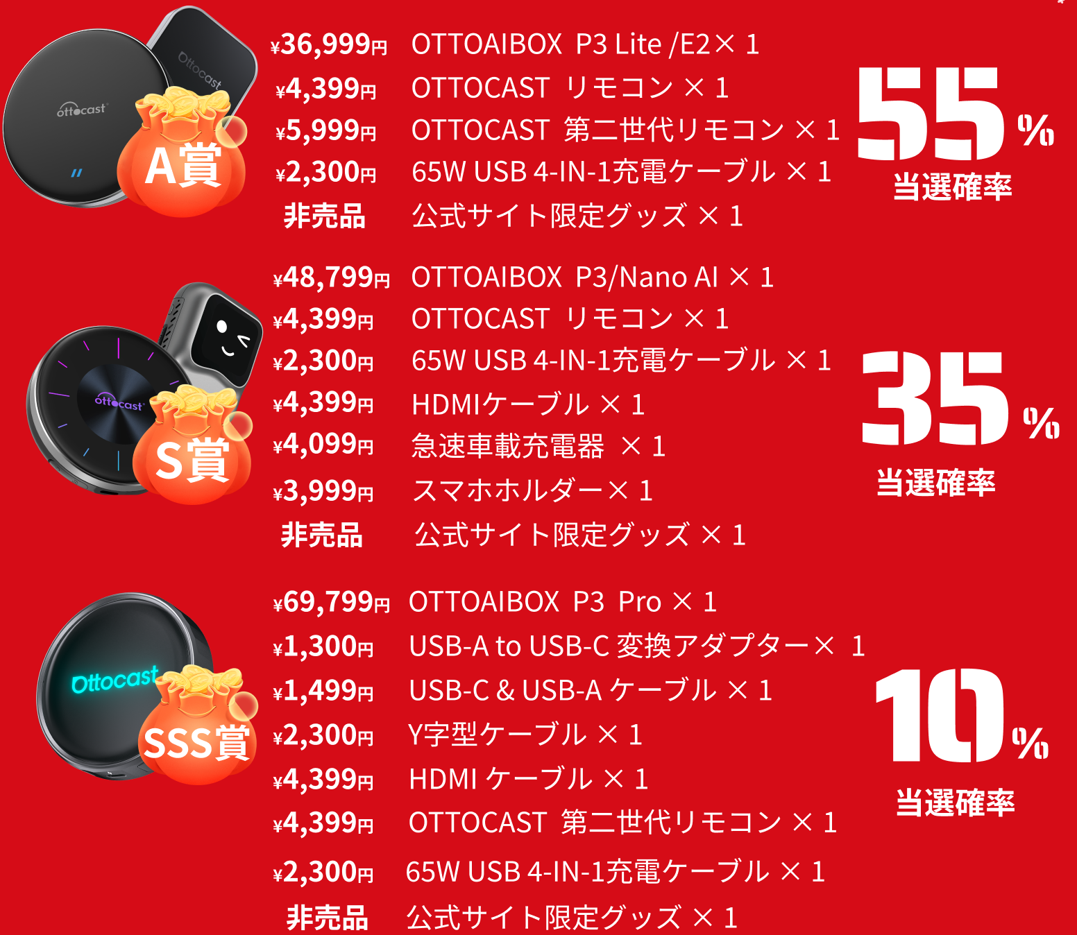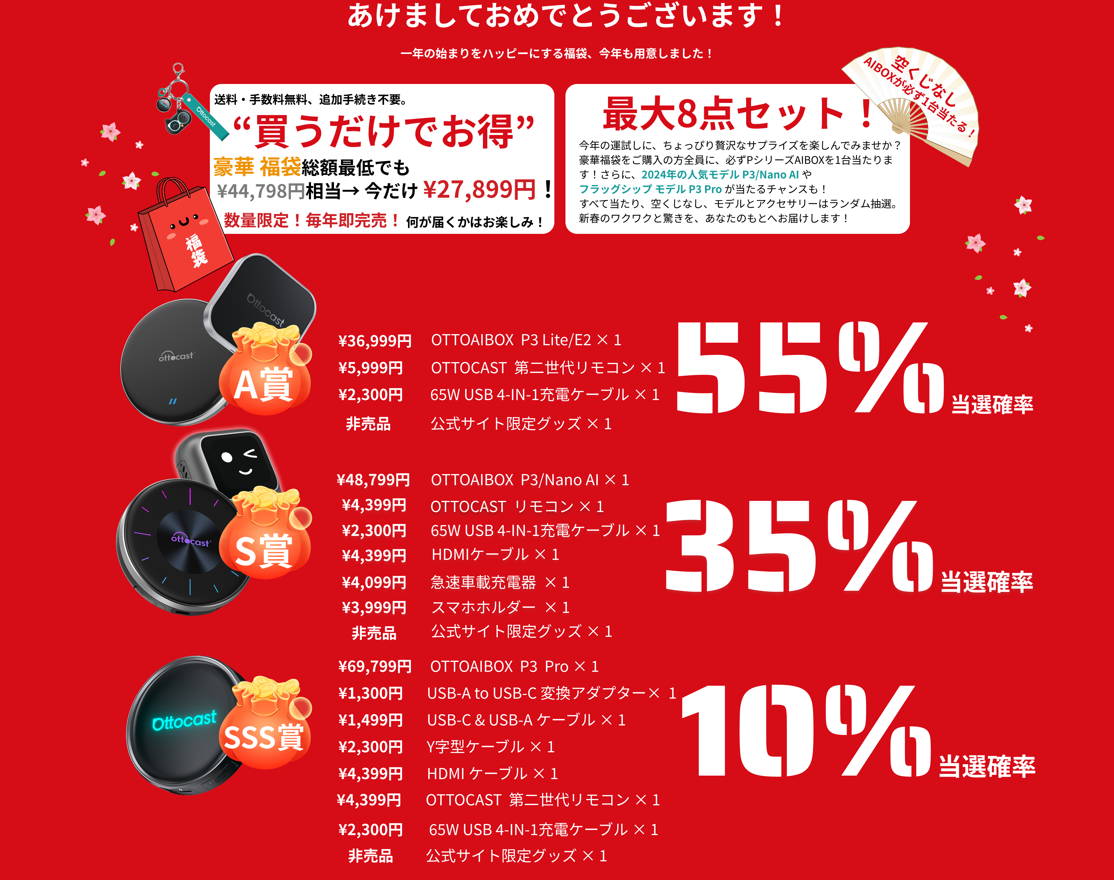 豪華福袋AIBOX賞品は「P3 Pro/P3/Nano AI/P3 Lite/E2」、新春福袋アダプター賞品は「Mirror Touch/MINI第二世代/MINI第三世代」やカーライフ アクセサリMagChargeの中からランダムで