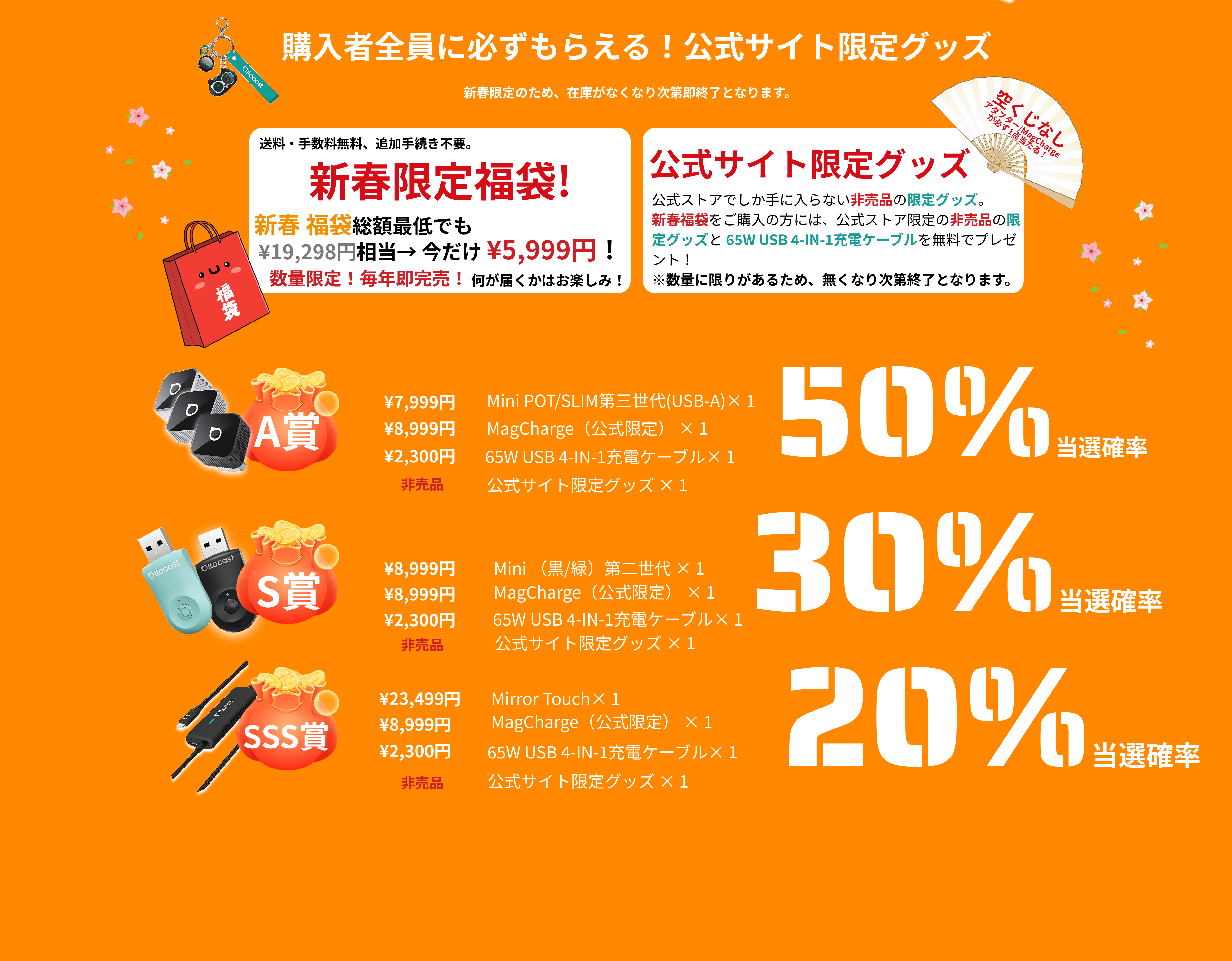 新春福袋には、アダプター製品やMagCharege が必ず1点封入されています。アダプター対象製品:mini二代 / mini三代 / MirrorTouch のいずれか。