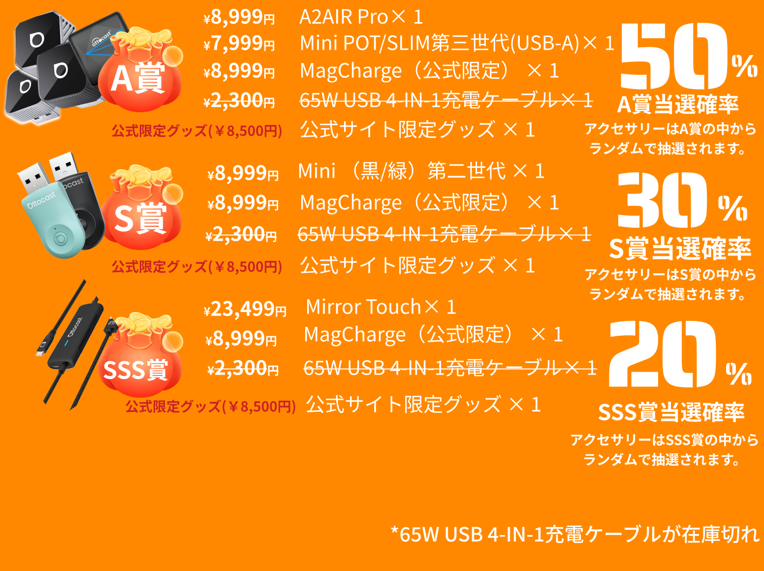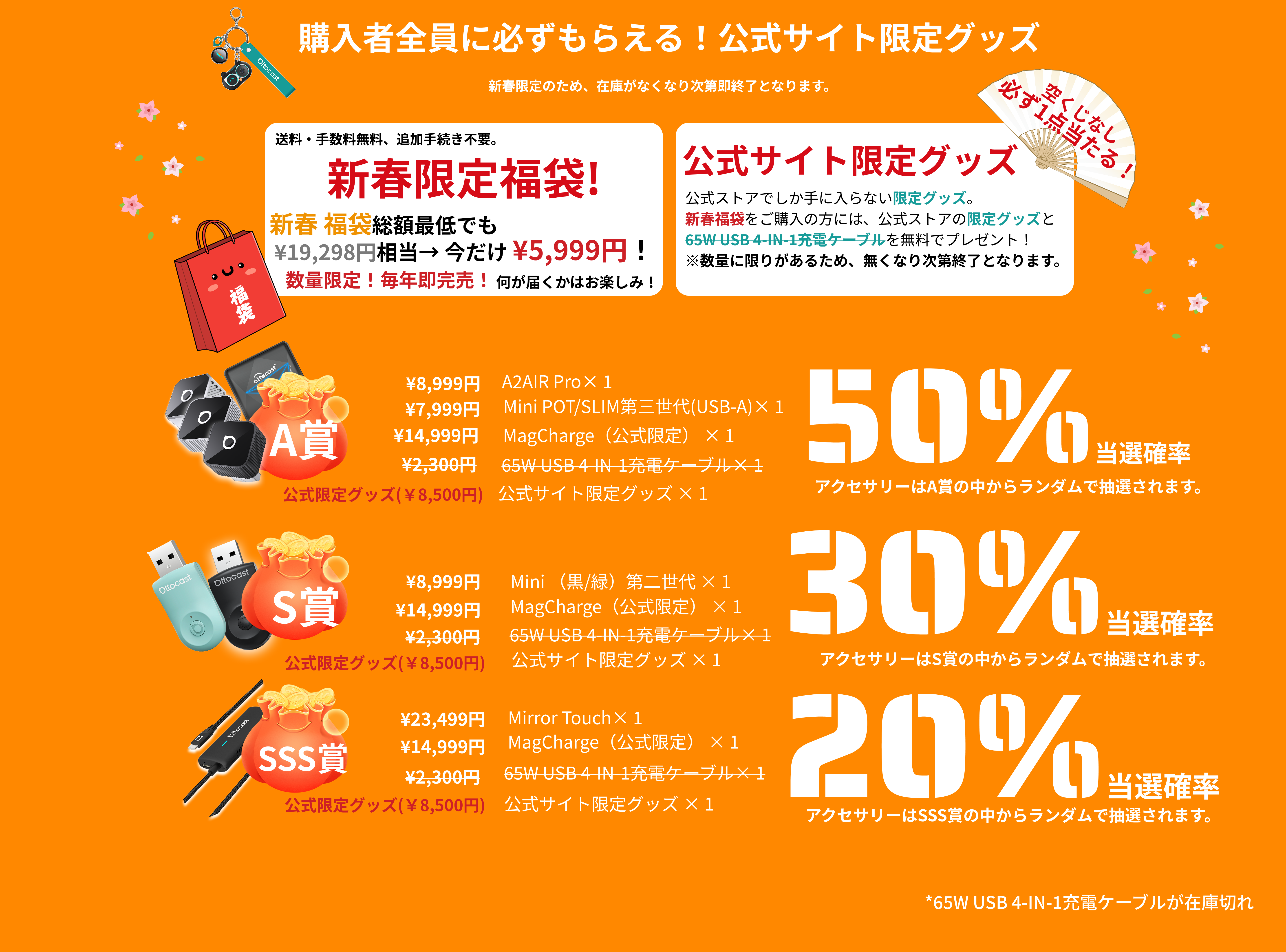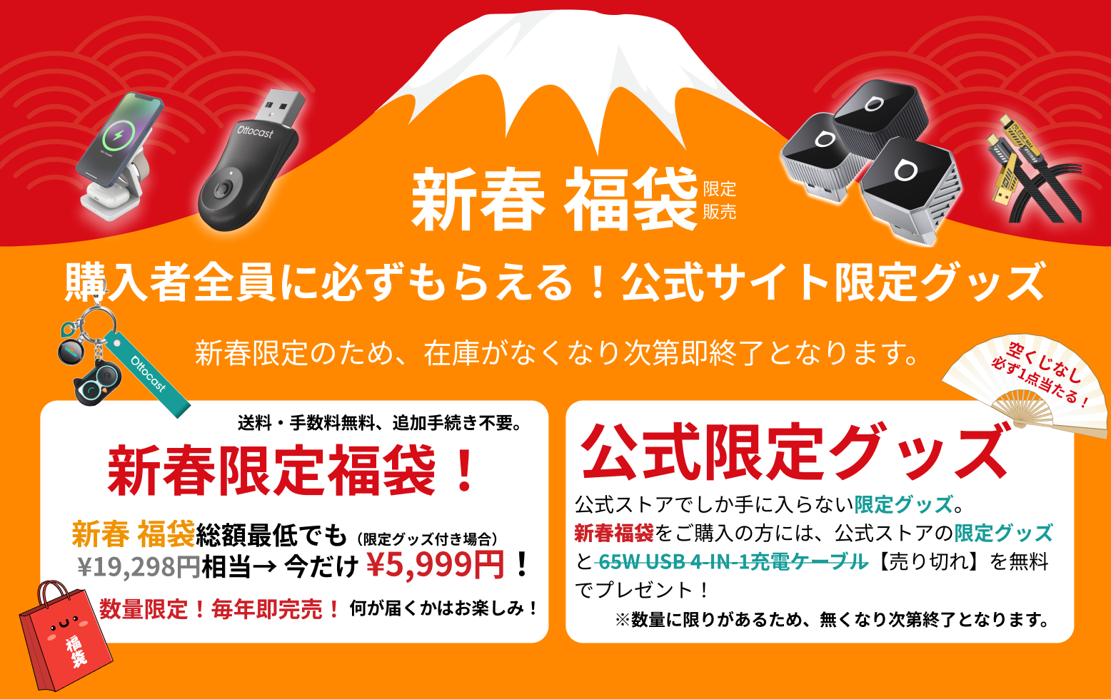 どちらの福袋をご購入いただいても、OTTOCAST 限定グッズと65W USB 4-IN-1充電ケーブルをプレゼント!