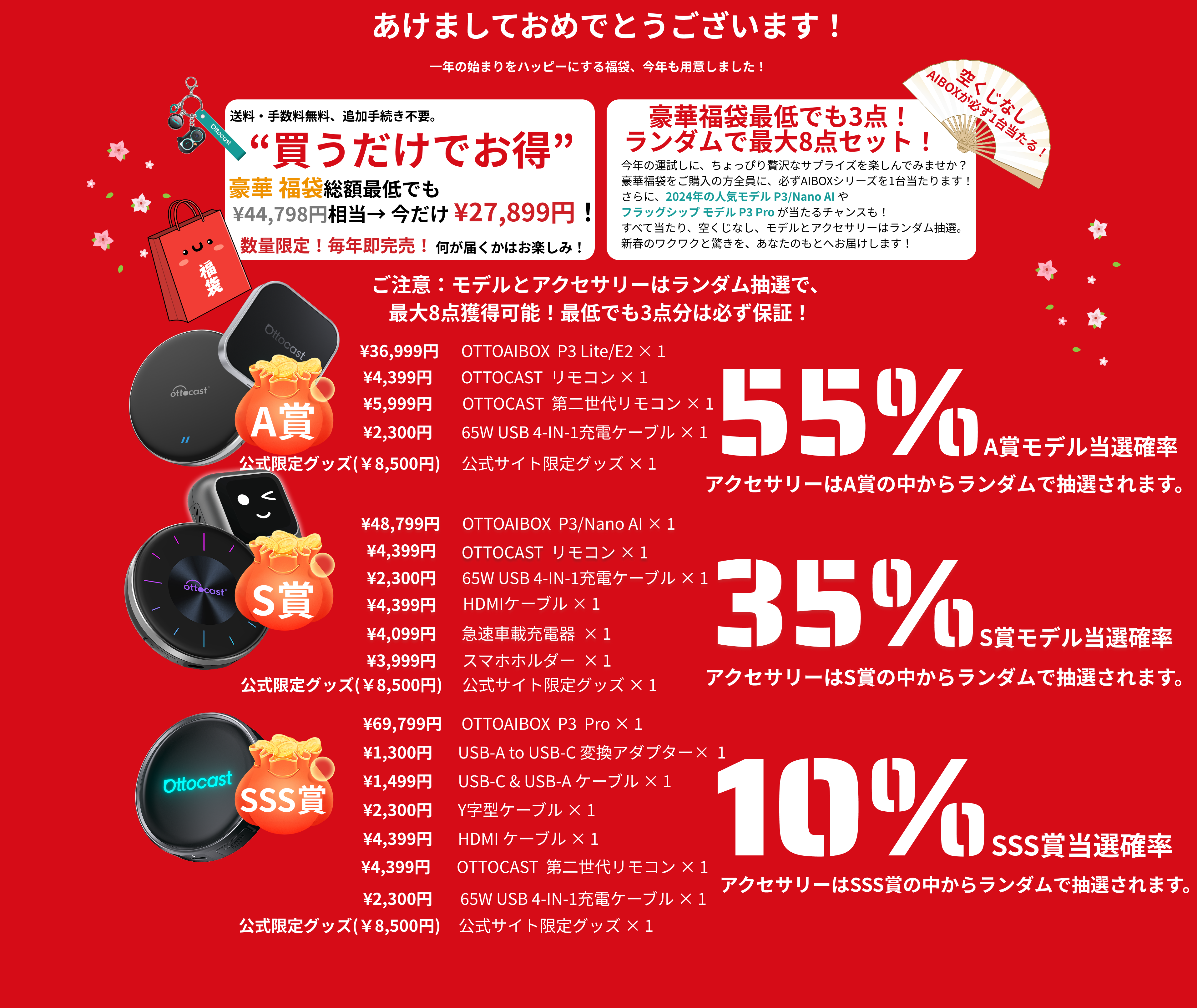 豪華福袋AIBOX賞品は「P3 Pro/P3/Nano AI/P3 Lite/E2」、新春福袋アダプター賞品は「Mirror Touch/A2air Pro/MINI第二世代/MINI第三世代」/MagChargeの中からランダムで