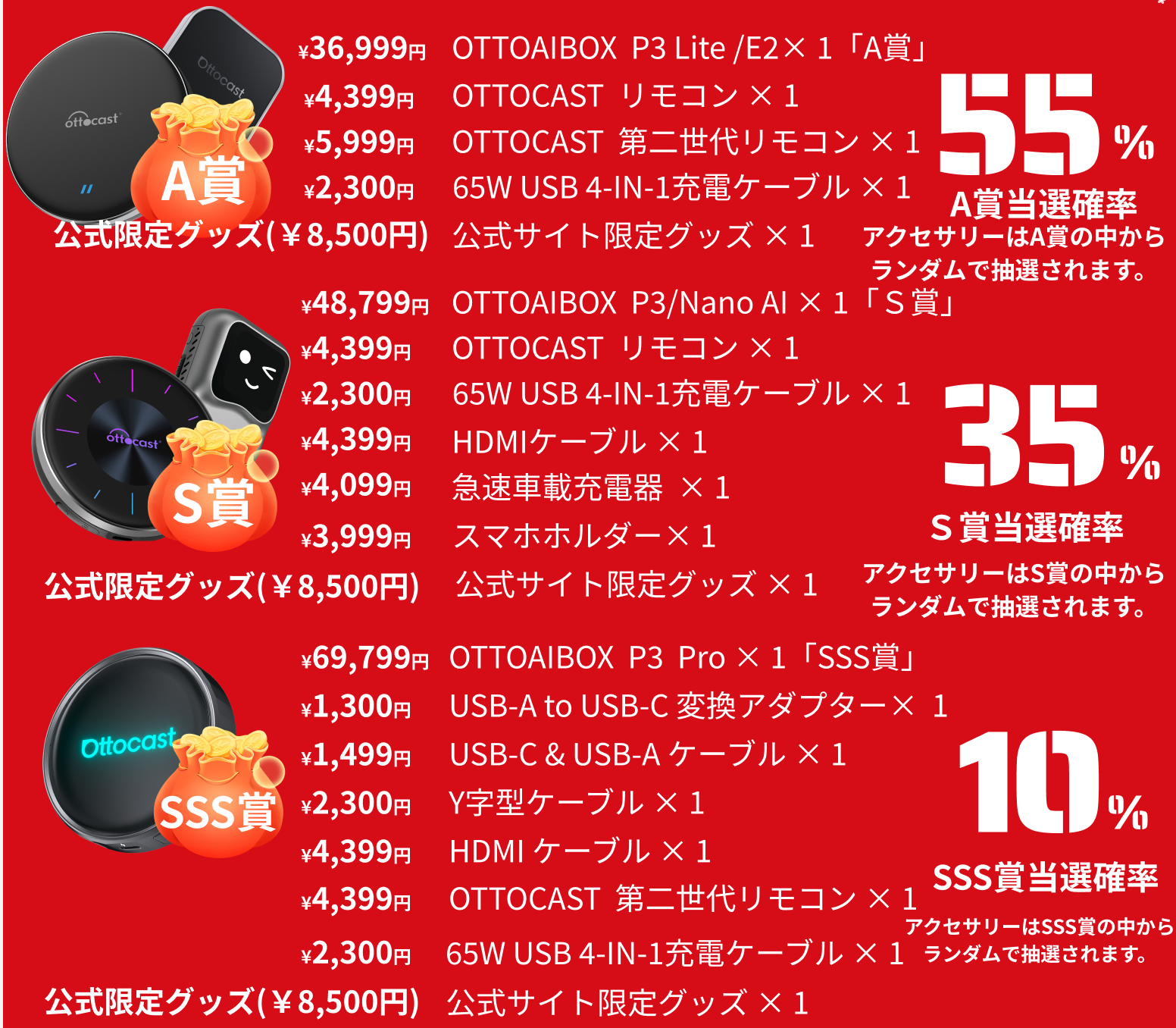P3 Pro/P3/Nano AI/P3 Lite/E2 の中からランダムで1点当選となります。アクセサリーは当選ランクの中からランダムで抽選されます。在庫限りがあるため、なくなり次第終了。