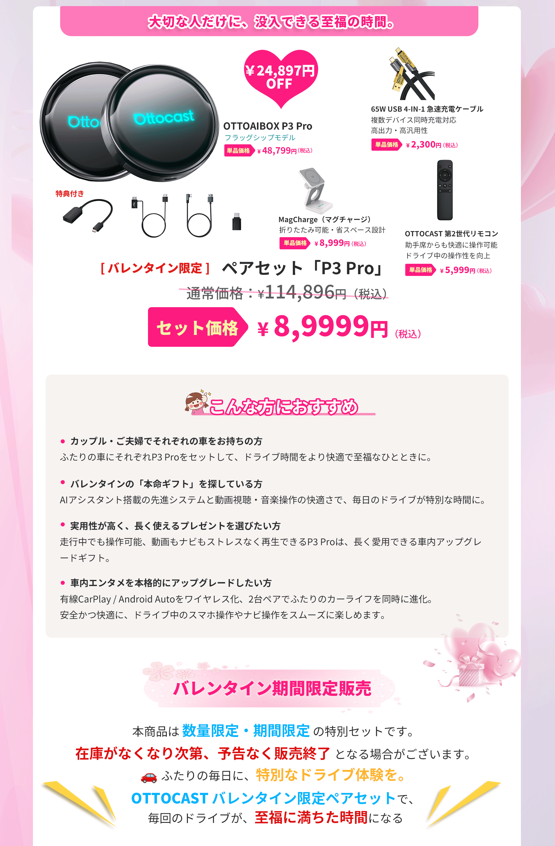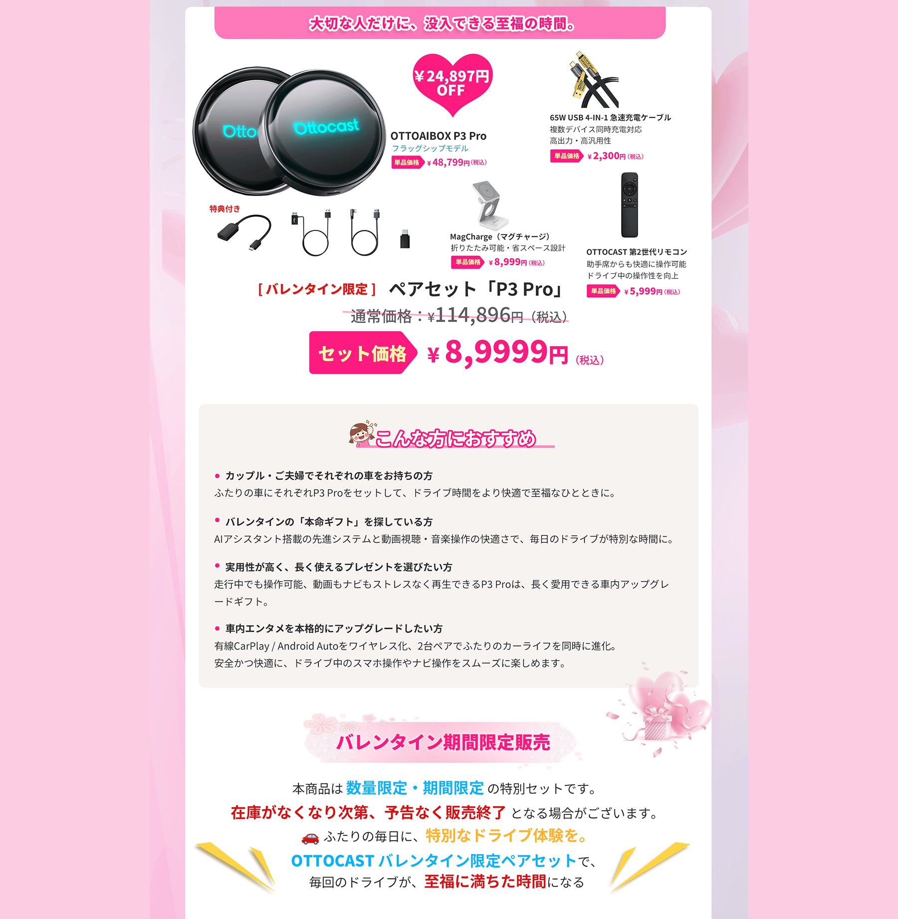 OTTOCASTの王道モデル「OTTOAIBOX P3 Pro」を2台含み、ふたりそれぞれのカーライフを快適にする、バレンタイン期間限定ペアセットです。