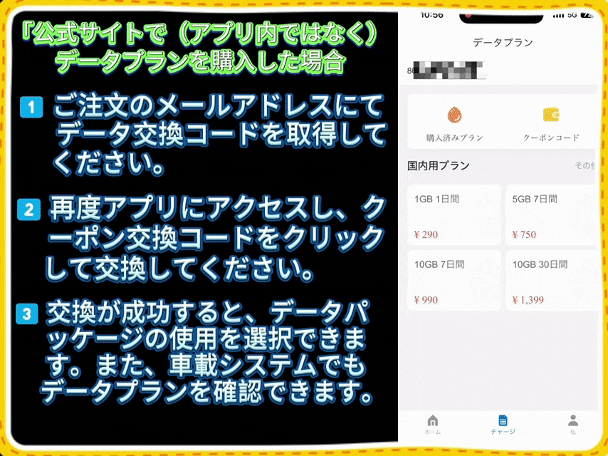 上記のクーポンコードでデータパッケージを購入すると、5%の割引になります。