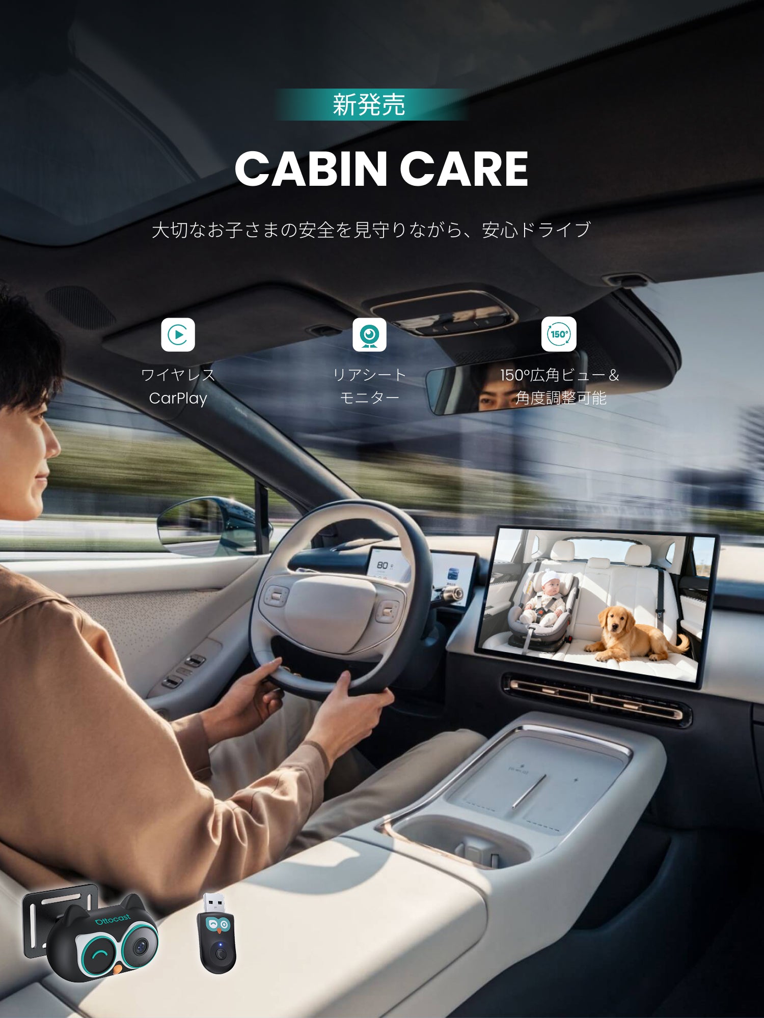 後席の安心をいつもそばに。ワイヤレスCarPlayに対応し、通話・音楽・ナビ操作を快適に。後席の様子をリアルタイムで確認でき、暗い車内でもナイトビジョンでしっかり見守ります。150°広角レンズと自由な角度調整で視界をしっかりカバー。取り付けも工具不要でかんたん。FOTA対応で常に最新の快適さを実現します。