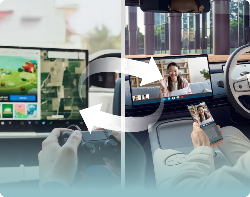 お気に入りの動画を後部モニター・車載ディスプレイ・外部モニターへ。 ゲーム機や会議システムにもつながるから、車が移動式オフィス / リビングに早変わり