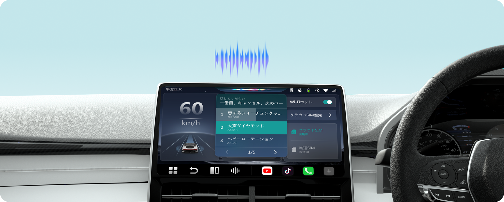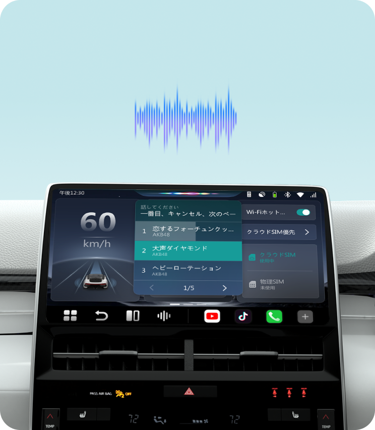 ハンドルから手を離さないまま操作完結。 ステアリングボタン or 画面タップでAIを起動。 目的地検索、ルート変更、音楽再生までワンフレーズ。 → 運転中の視線移動・誤操作のリスクを最小限に。
