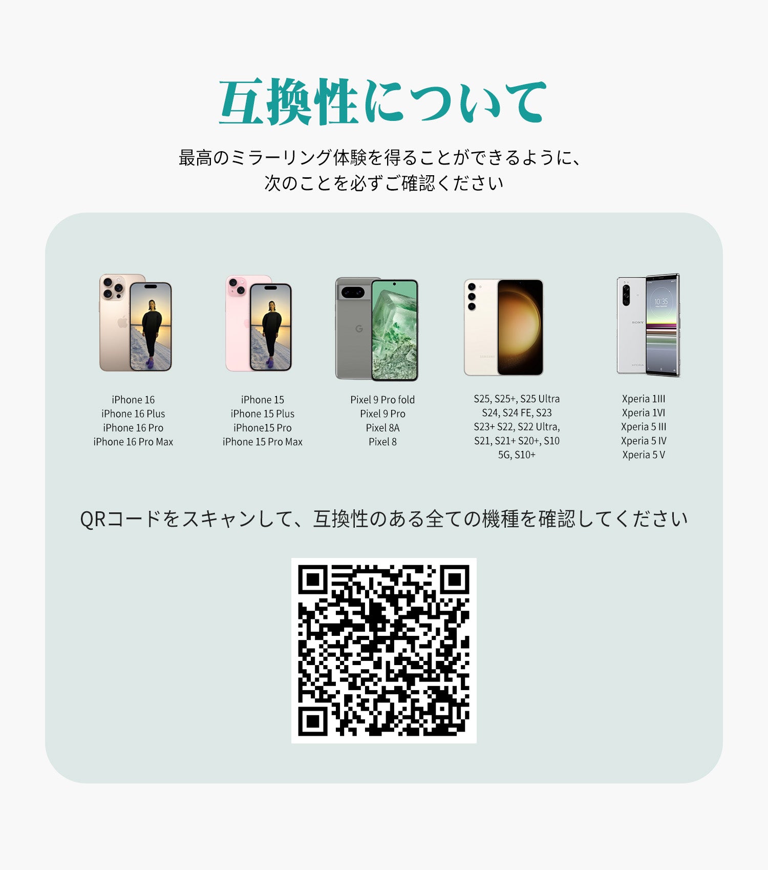iOS15以上のiPhoneおよびDP(DisplayPort)規格に対応したAndroidスマホのみご利用いただけます。